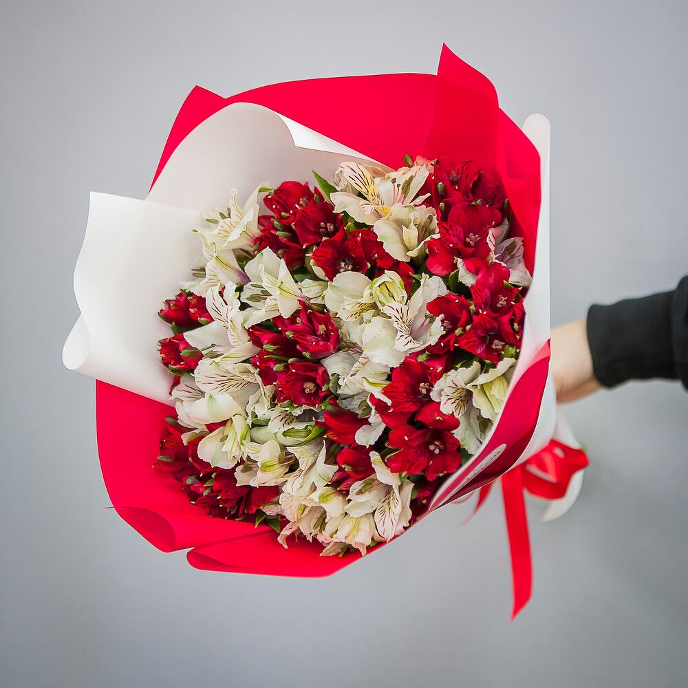 альстромерия красные – 8 шт.альстромерия белые – 7 шт.Упаковка крафт – 1 шт.Атласная лента – 1 шт.