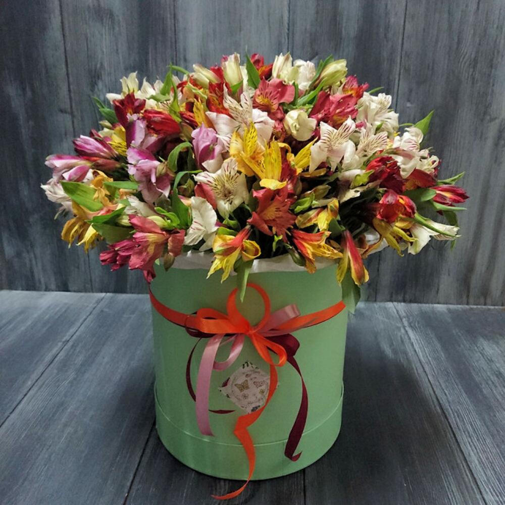 Альстромерия – 25 шт.Шляпная коробка с лентой – 1 шт.Оазис флористический – 1 шт.