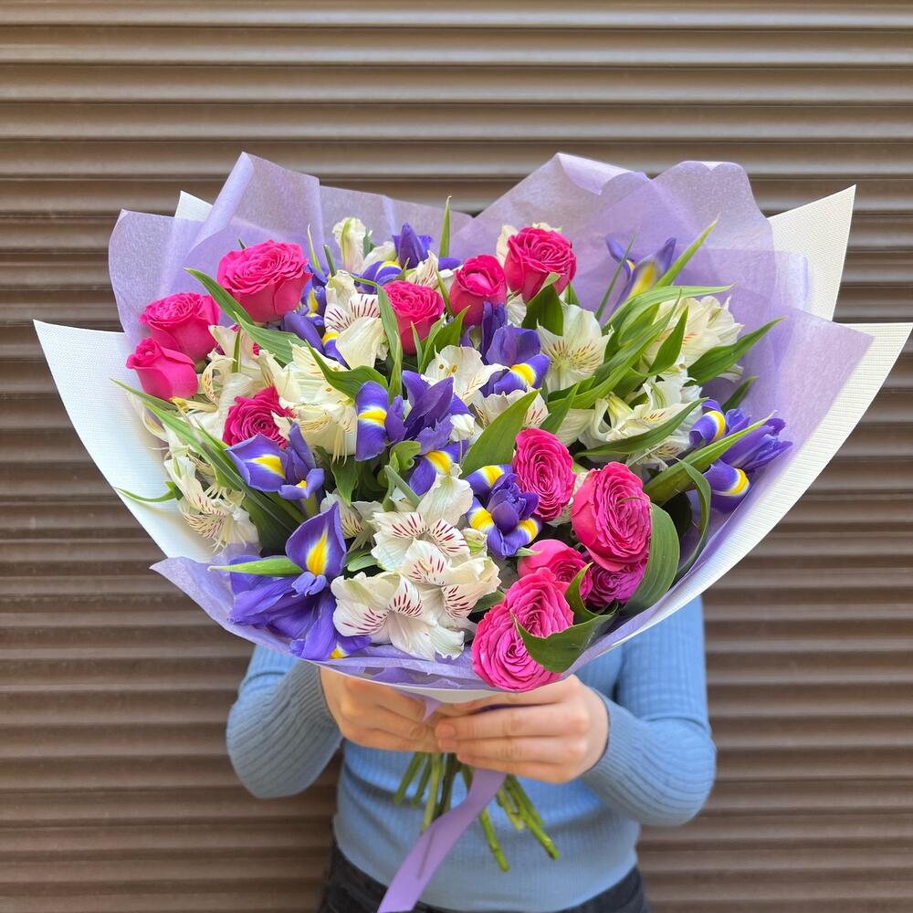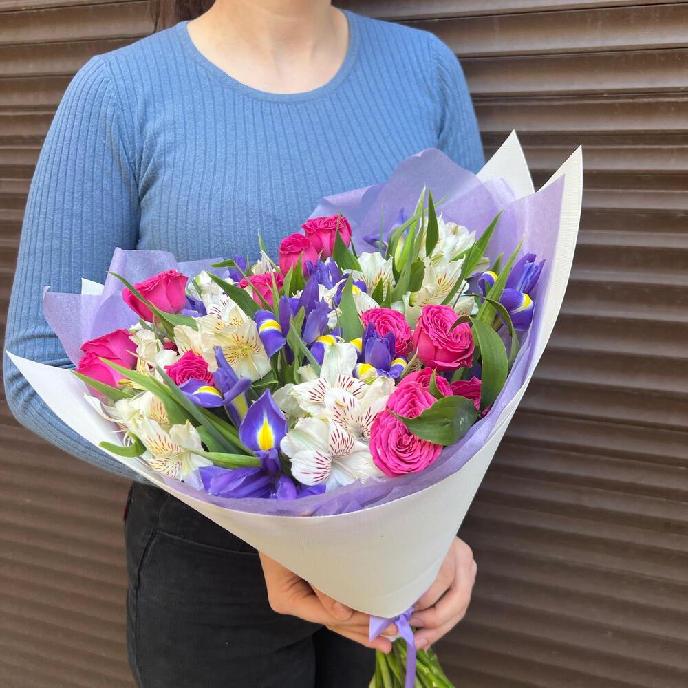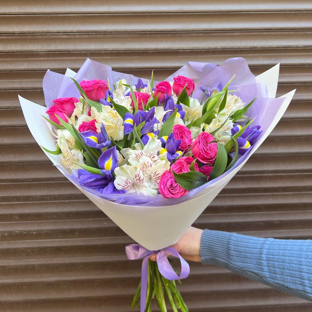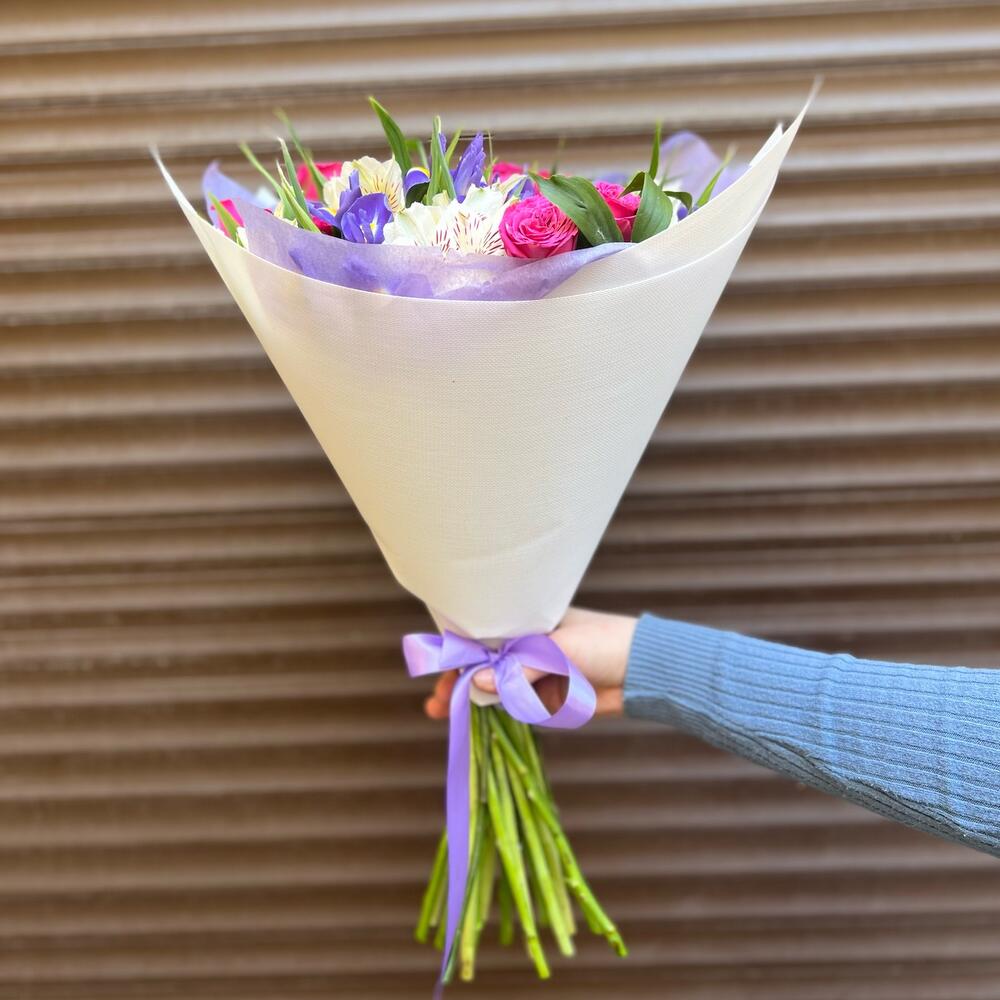 Альстромерия – 7 шт.Ирис – 10 шт.Зелень – 5 шт.Тишью – 2 шт.Пленка дизайнерская – 2 шт.классик сенсейшен – 3 шт.