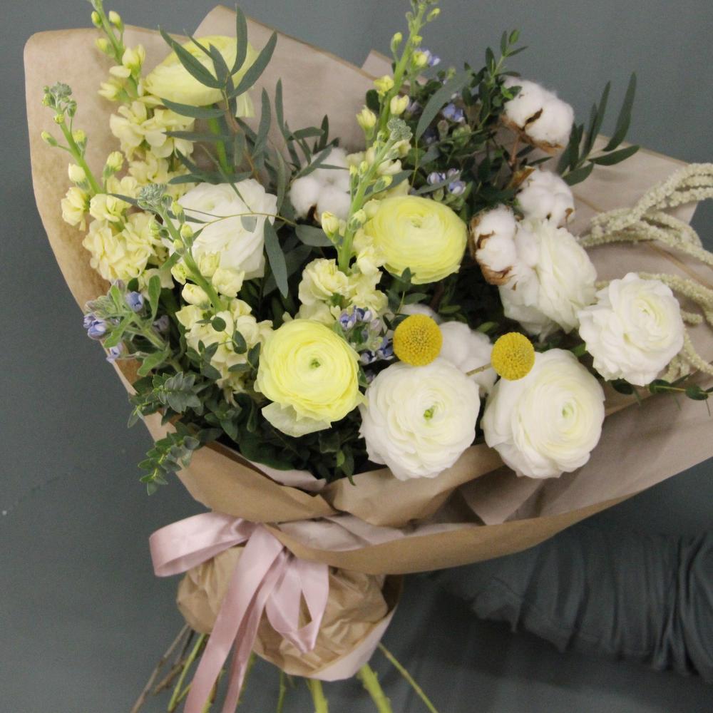 Авторский букет с ранункулюсами, ароматной маттиолой, твидией, хлопком, эвкалиптом, краспедией и амарантом.Ширина букета около 50 сантиметров, высота букета около 60 сантиметров.Стильное цветочное решение для любого случая.Отличный выбор для подарка на день всех влюблённых, 14 февраля.
