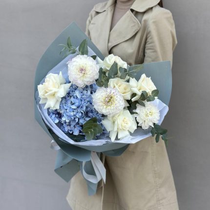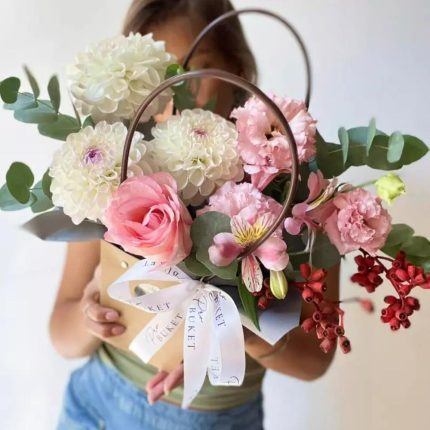 Гвоздики, Георгины, Диантус, Лизиантусы, Розы, Эвкалипт, Эустома