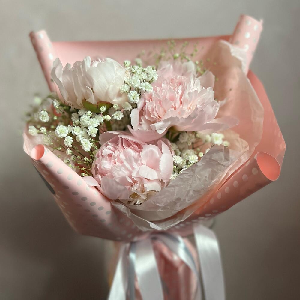 Гипсофила – 2 шт.Атласная лента – 1 шт.декоративная упаковка – 1 шт.пионы – 3 шт.