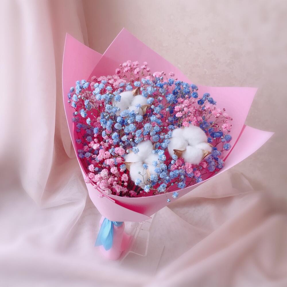 Хлопок – 3 шт.Лента атласная – 1 шт.Упаковка дизайнерская – 1 шт.гипсофила радужная – 3 шт.