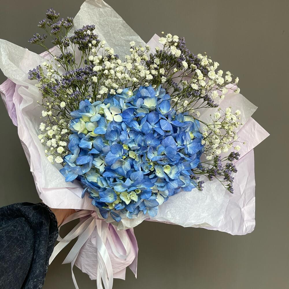 Гипсофила – 2 шт.Гортензия – 1 шт.Лимониум – 3 шт.Упаковка дизайнерская – 1 шт.