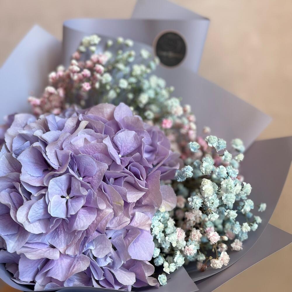 Гортензия – 1 шт.Гипсофила – 2 шт.декоративная упаковка – 1 шт.Атласная лента – 1 шт.
