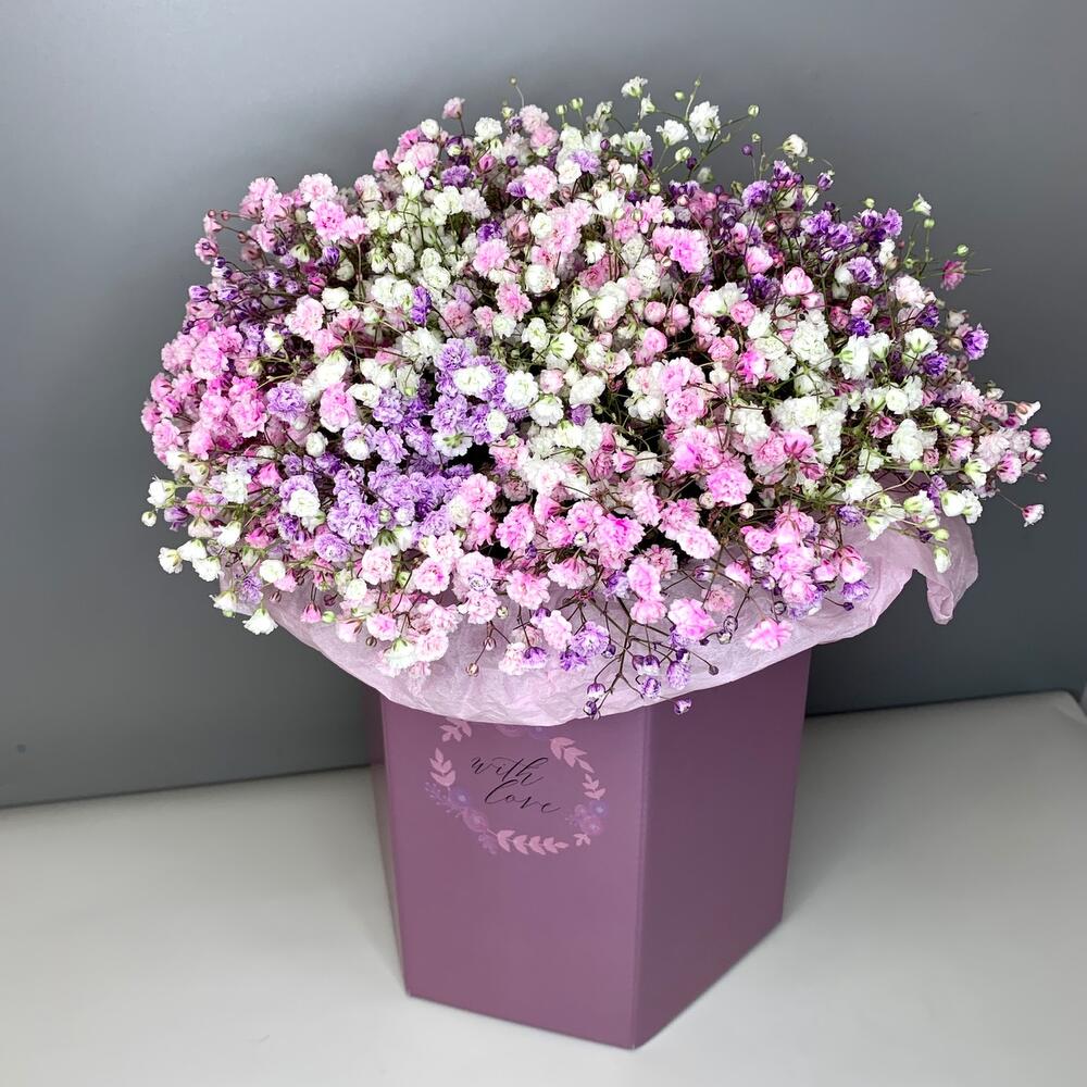 гипсофила радужная – 9 шт.Коробка шляпная – 1 шт.Тишью – 2 шт.Оазис флористический – 1 шт.Пленка прозрачная – 1 шт.Лента атласная – 2 шт.