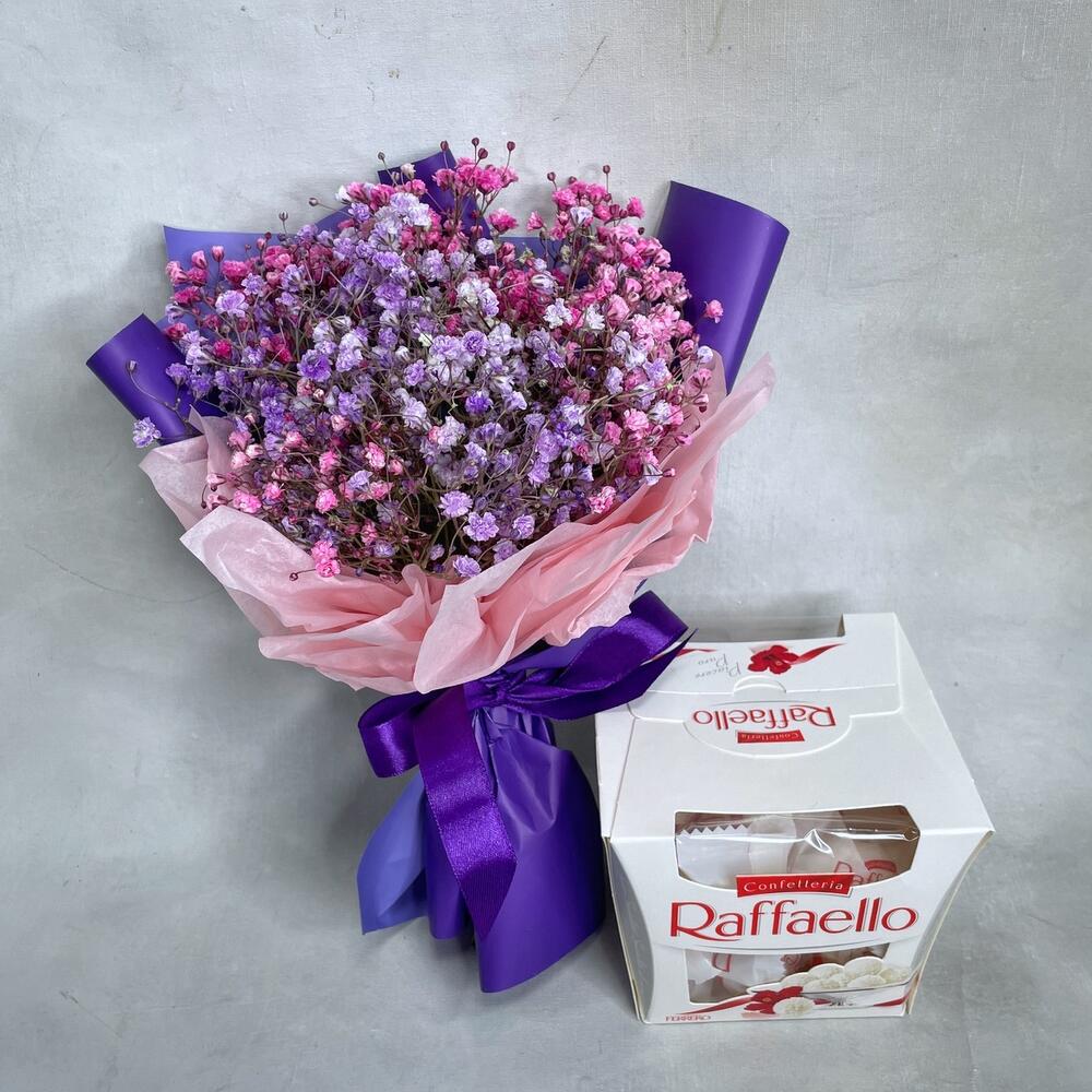 Гипсофила – 3 шт.Упаковка тишью – 1 шт.Упаковка пленка матовая – 1 шт.Лента атласная – 1 шт.raffaello 150 гр – 1 шт.Пакет крафт – 1 шт.