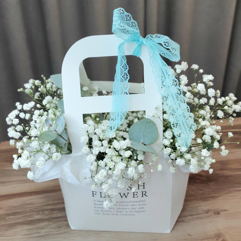 Лента Кружево – 1 шт.Эвкалипт пучок – 1 шт.Оазис флористический – 1 шт.сумочка декоративная – 1 шт.Гипсофила – 4 шт.