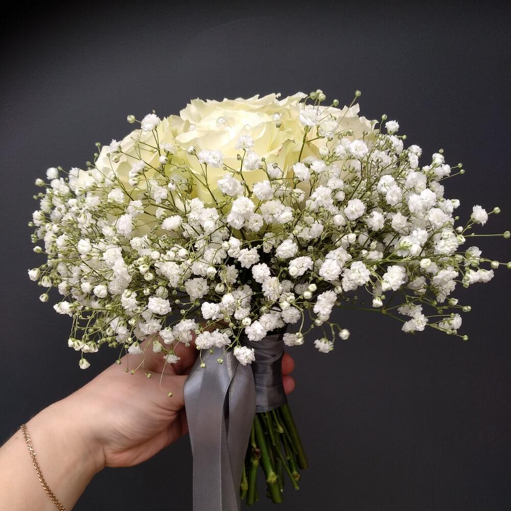 розы мондиаль – 7 шт.гипсофила белая – 4 шт.Лента атласная – 1 шт.бусины – 11 шт.