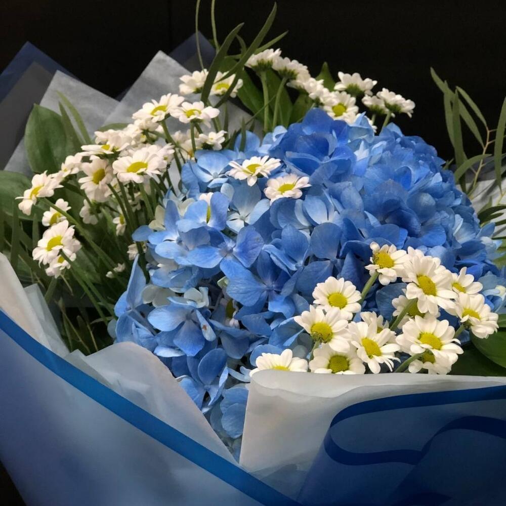 Гортензия – 1 шт.Ромашка кустовая – 3 шт.эвкалипта – 2 шт.Рускус – 6 шт.Упаковка дизайнерская – 1 шт.Лента атласная – 1 шт.