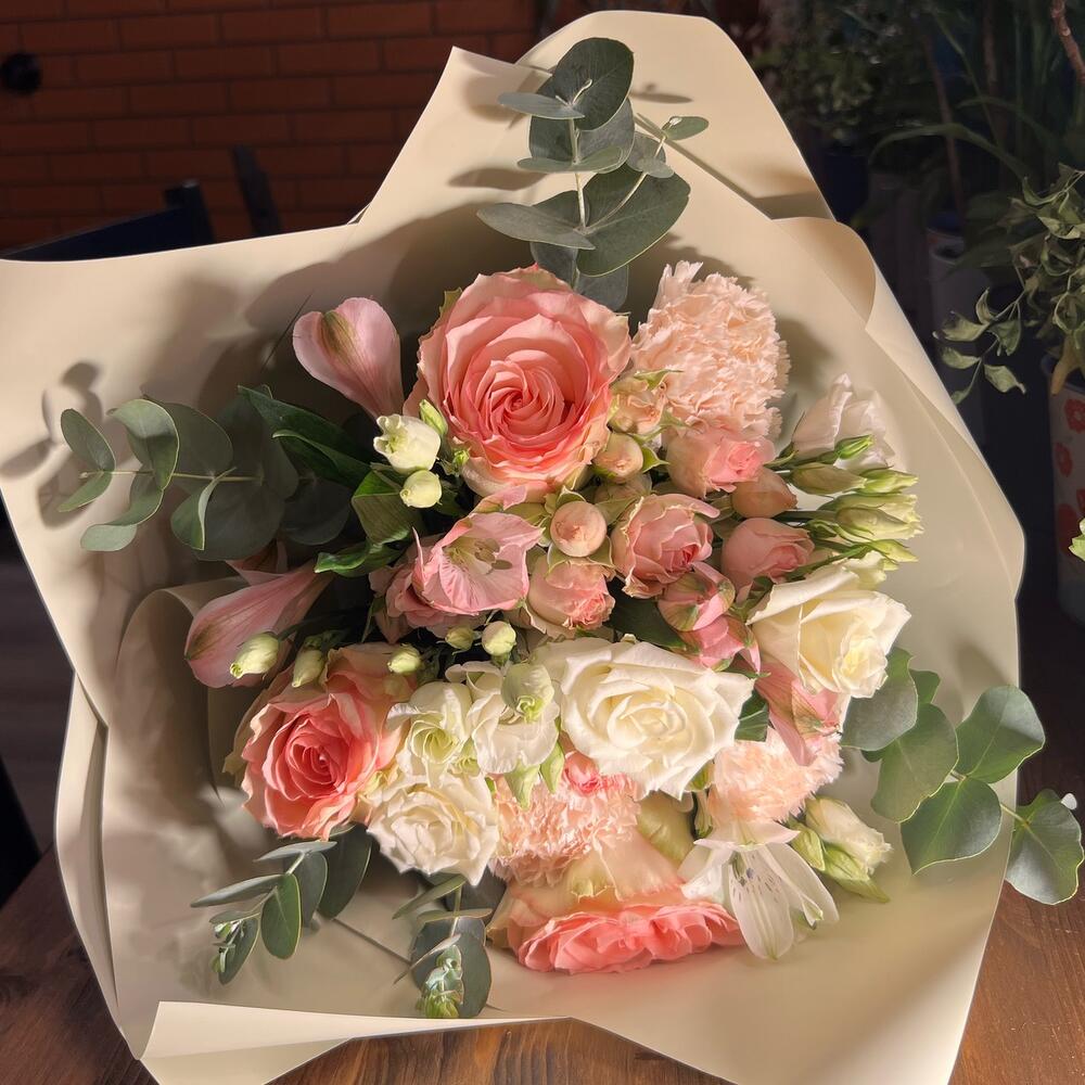 Роза одноголовая эквадор 50 см – 3 шт.Роза кустовая – 4 шт.Диантус сортовой – 3 шт.Альстромерия – 2 шт.Эустома – 3 шт.Эвкалипт – 4 шт.