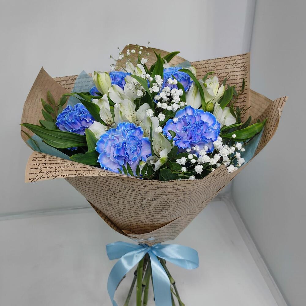 Букет из 5 Диантусов голубых, Альстромерии и Гипсофилы