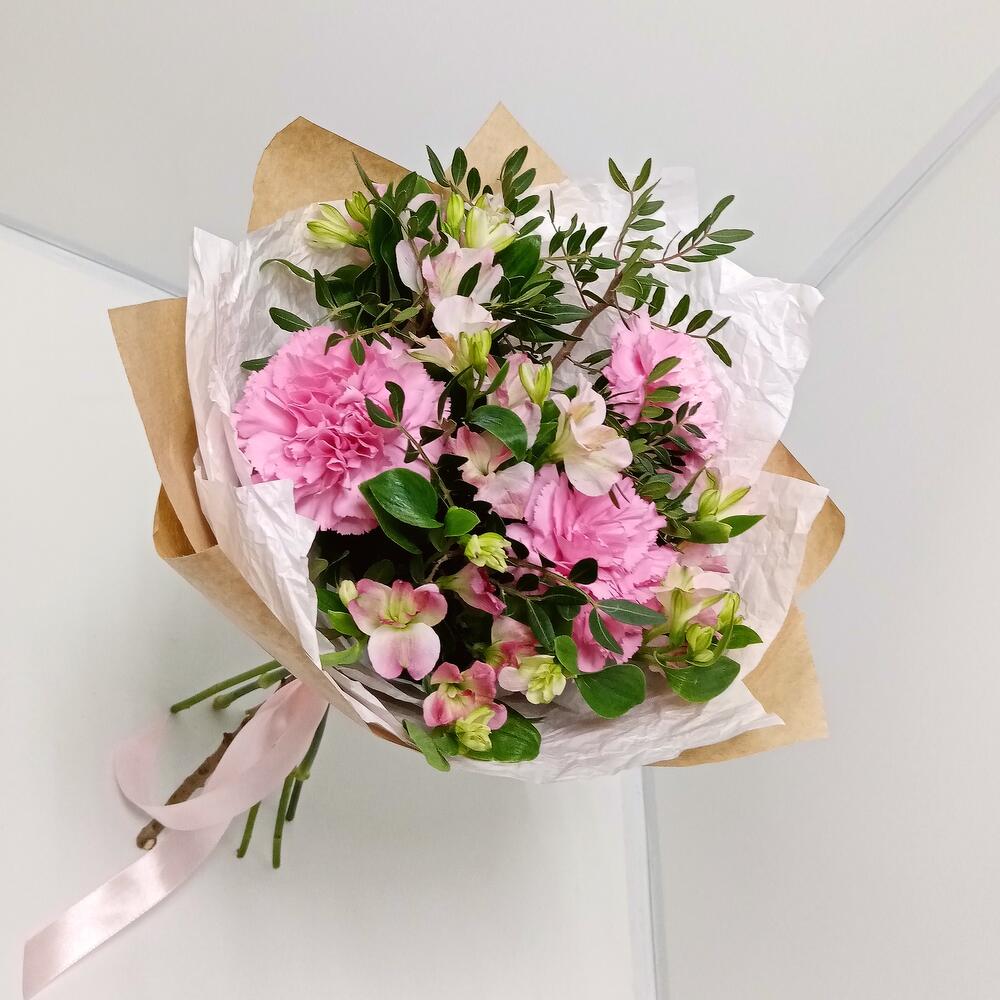 Альстромерия – 4 шт.Фисташка – 2 шт.Дизайнерская упаковка – 1 шт.диантусы – 3 шт.