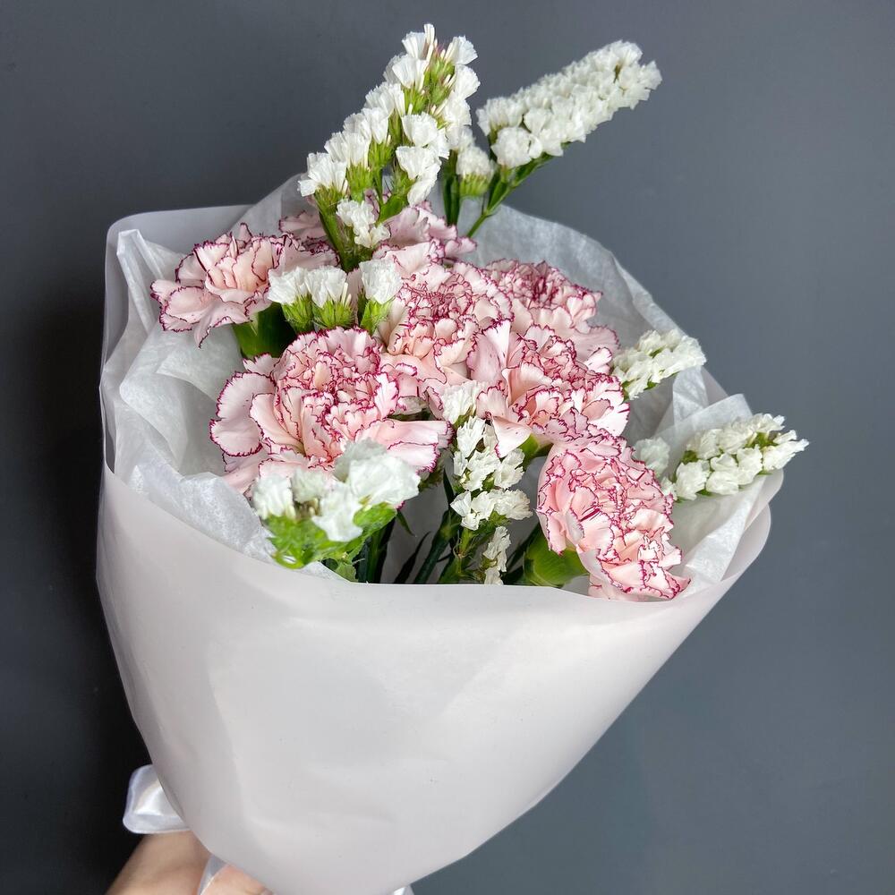 Гвоздика сортовая – 7 шт.Статица белая – 2 шт.Упаковка – 1 шт.