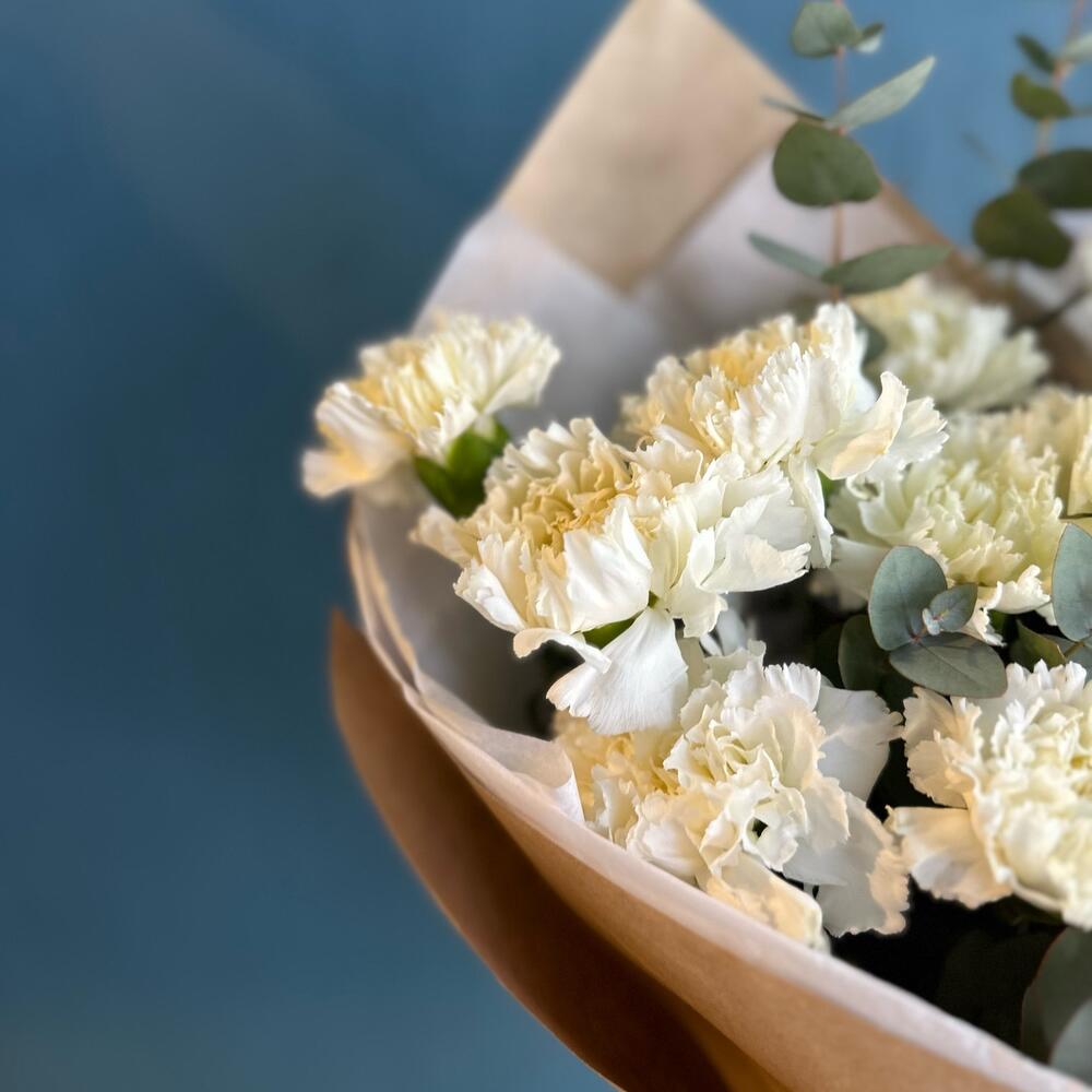 Диантус – 13 шт.Эвкалипт – 1 шт.Крафт упаковка – 1 шт.Тишью – 1 шт.Лента атласная – 1 шт.