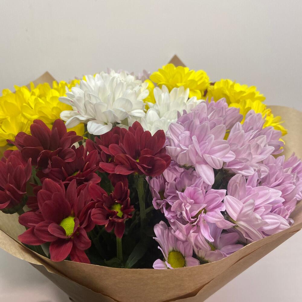 Хризантема кустовая – 7 шт.Упаковка крафт – 1 шт.Лента – 1 шт.