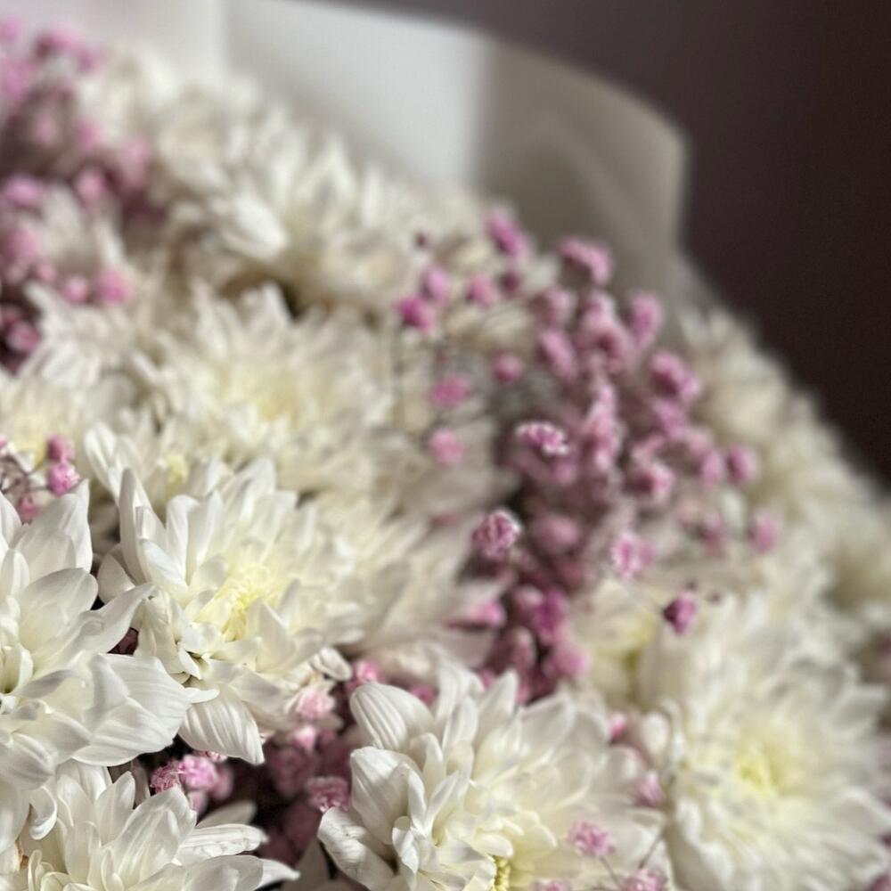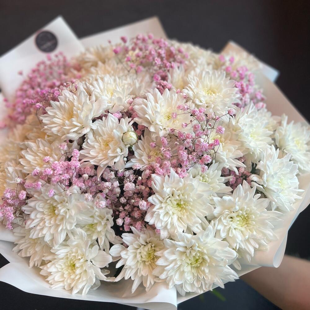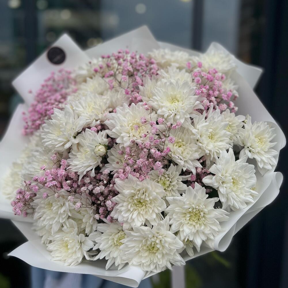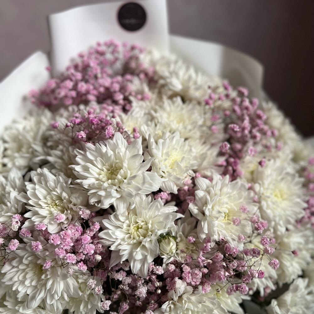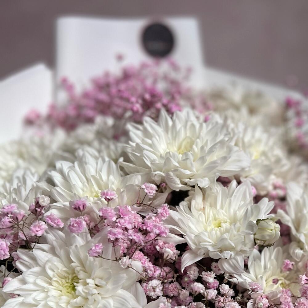 Кустовая хризантема – 11 шт.Атласная лента – 1 шт.Гипсофила розовая – 5 шт.декоративная упаковка – 1 шт.