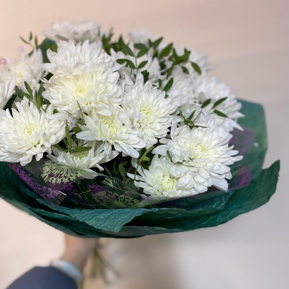 Хризантема кустовая – 7 шт.Упаковка – 2 шт.Лента атласная – 5 шт.фисташка зелень – 7 шт.