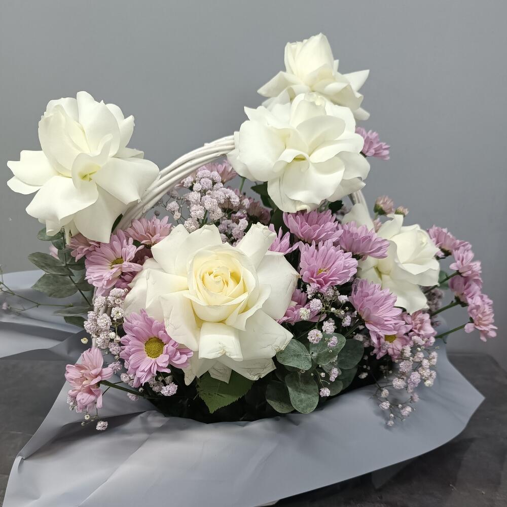 Авторская композиция из шикарных белых французских роз и ромашковых хризантем в изумительной окраске!