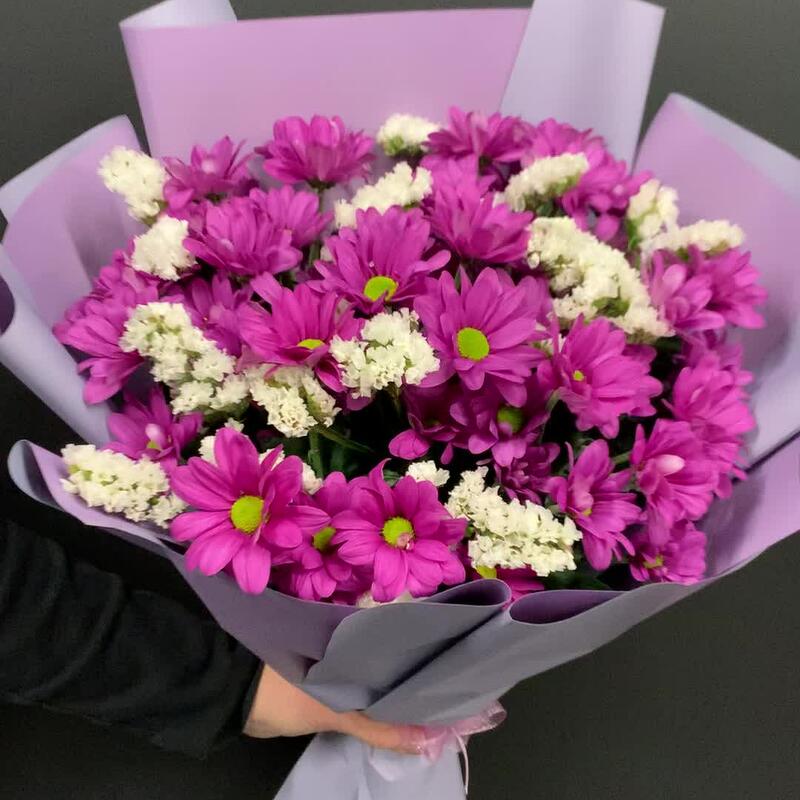 Хризантема кустовая – 7 шт.Статица – 2 шт.Упаковка дизайнерская – 1 шт.