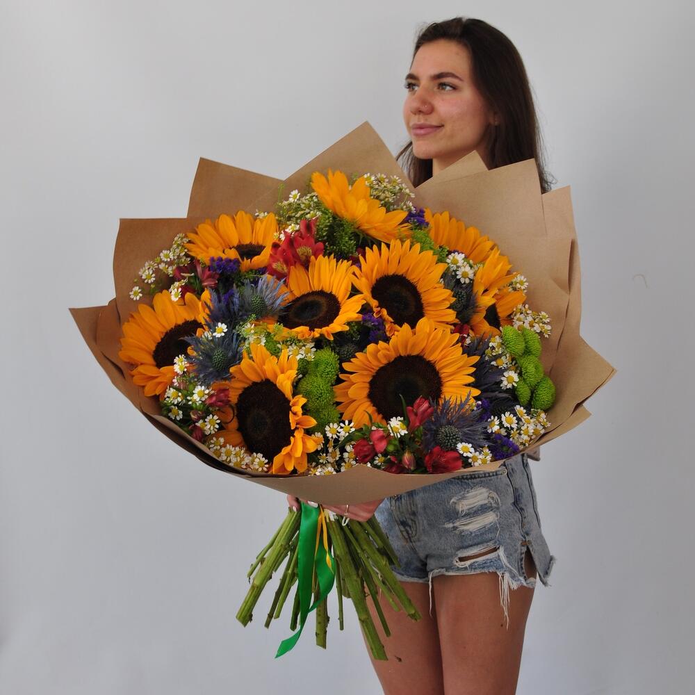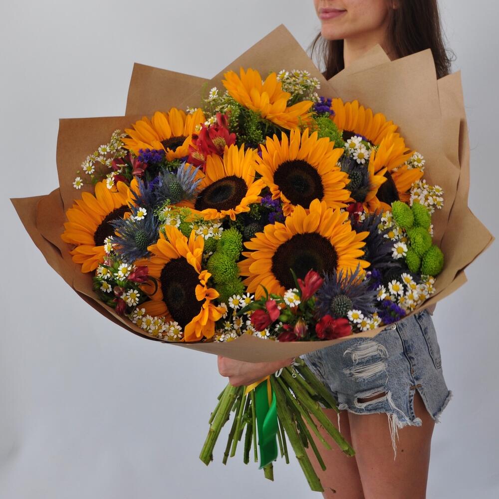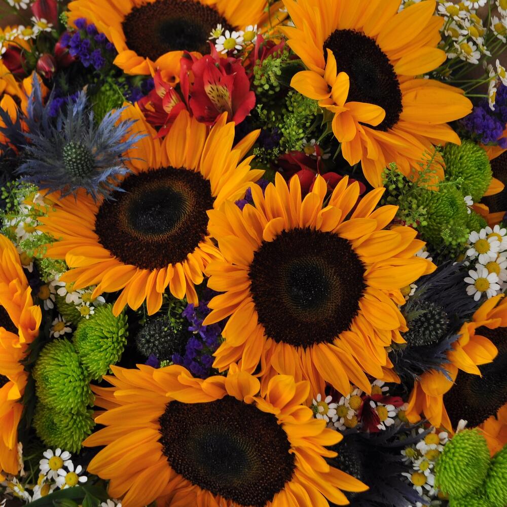 Альстромерия – 6 шт.Статица – 4 шт.Тласпи – 3 шт.Хризантема кустовая – 5 шт.Эрингиум – 2 шт.Ромашка – 5 шт.Подсолнух – 9 шт.