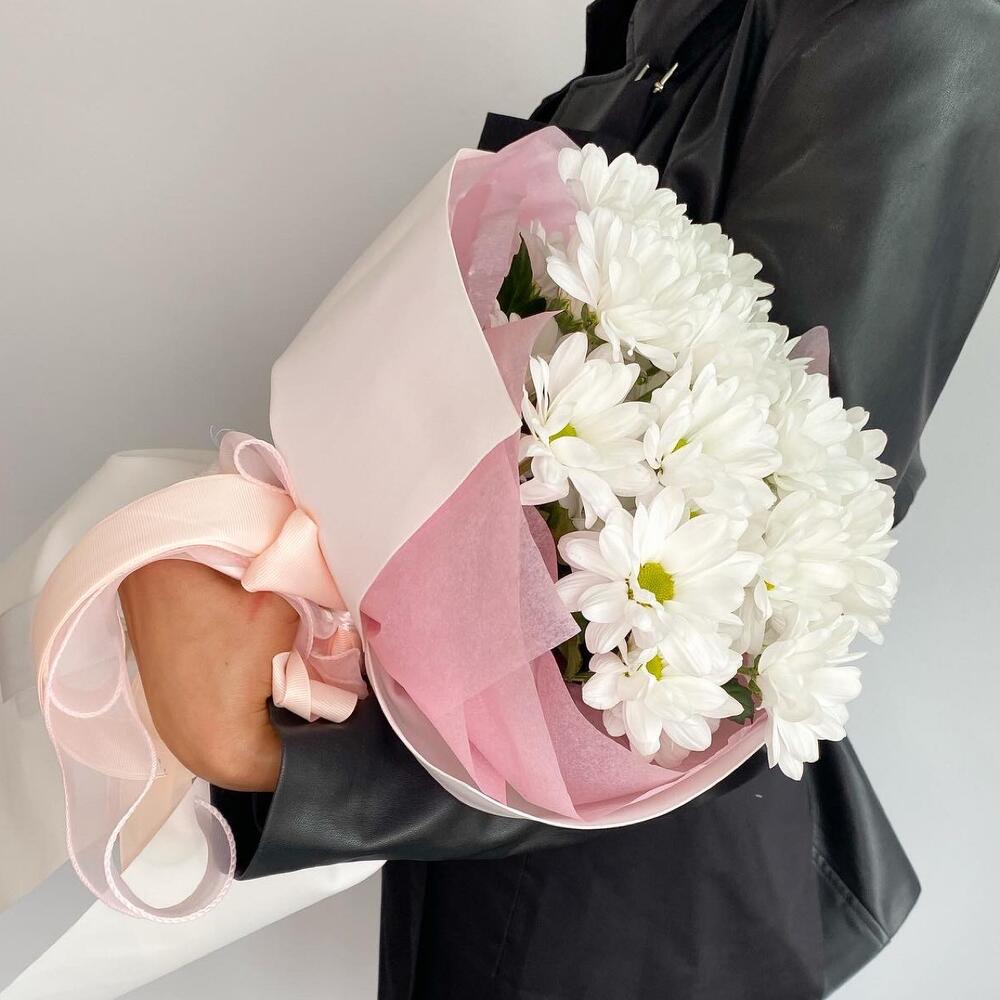 Букет из ромашковых хризантем в стильном дизайнерском оформлении.Уважаемые покупатели! Пожалуйста обратите ваше внимание на размер букета при заказе! Он учитывается вместе с упаковкой Чтобы наши прекрасные букеты дольше радовали получателя рекомендуем вам:⭐Обновить срез букета перед тем, как поставить его в воду⭐Ставить цветы в прохладную проточную воду ⭐Меняйте воду в вазу каждый день⭐Не забывайте подрезать цветы, перед тем, как ставить их в воду⭐Не ставить у отопительных приборов и на сквозняке Фирменный стиль наших букетов разработан специально так, чтобы упаковку не нужно было снимать, так как она придаёт целостность букету и прекрасно держится в вазе