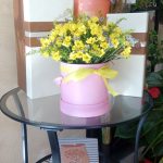 Хризантема кустовая – 15 шт.Лаванда (сухоцвет) – 33 шт.Зелень – 9 шт.Коробка шляпная – 1 шт.Оазис флористический – 1 шт.Лента – 1 шт.
