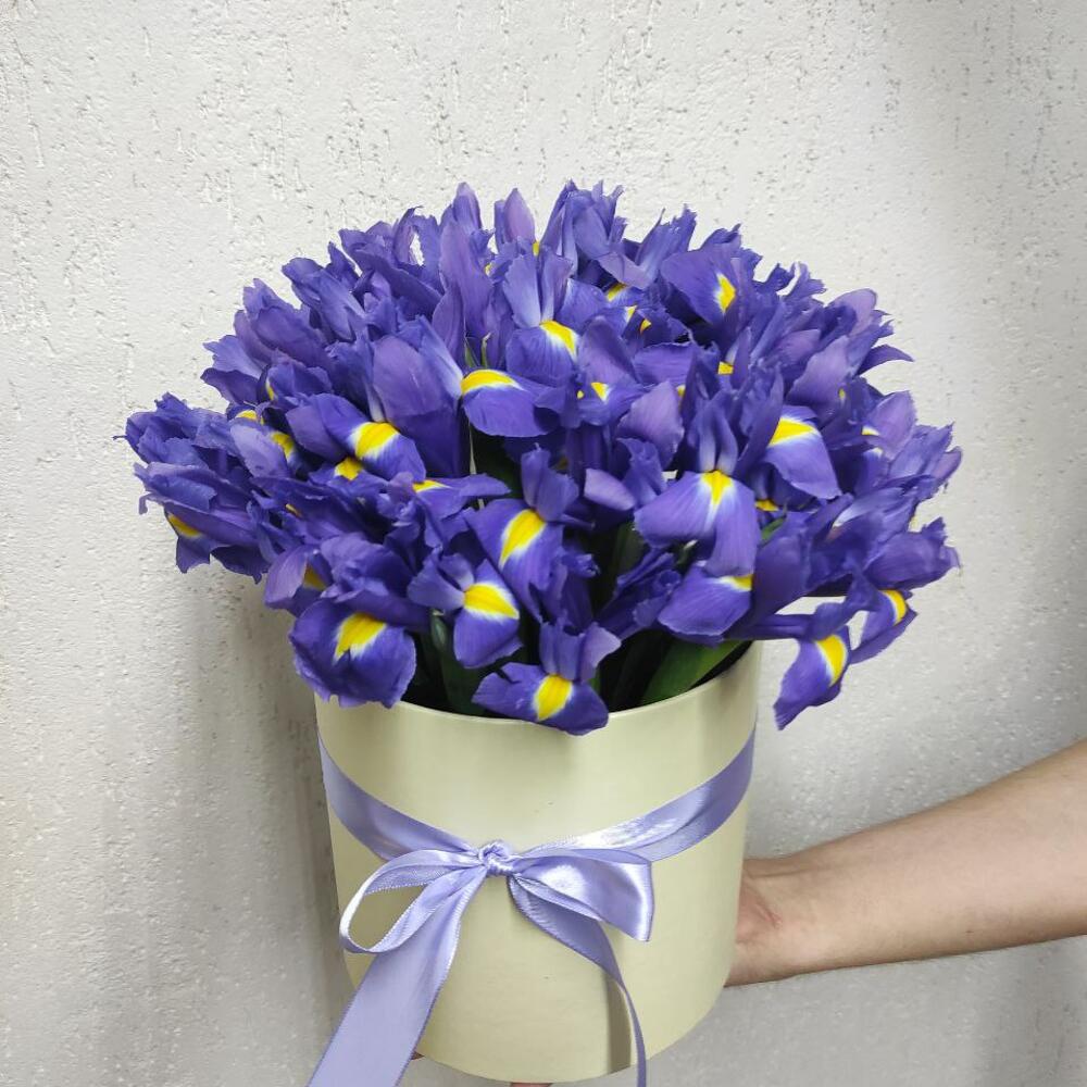 Шляпная коробка – 1 шт.Атласная лента – 1 шт.Ирис Blue Magic – 31 шт.