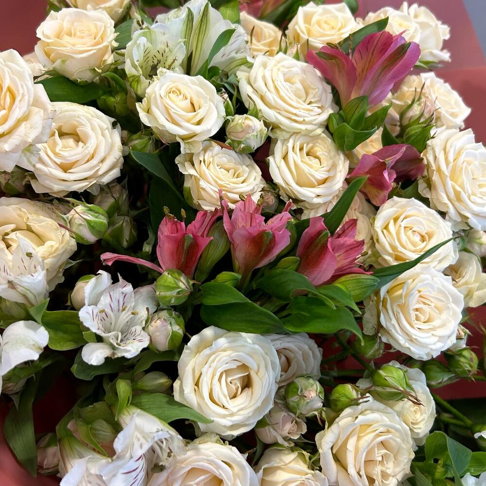 Букет из кремовых кустовых роз и альстромерии