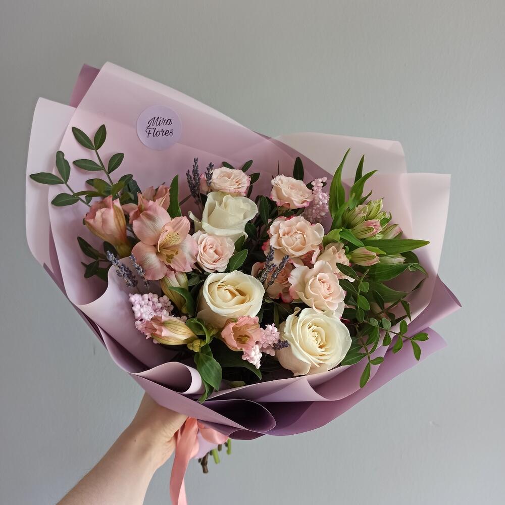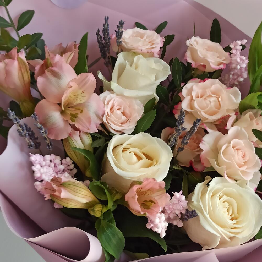 Букет из кустовых роз, роз, альстромерии, лаванды и сорго