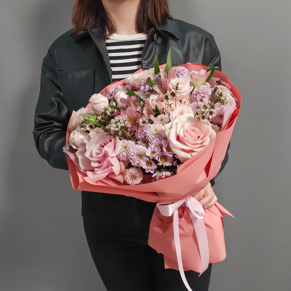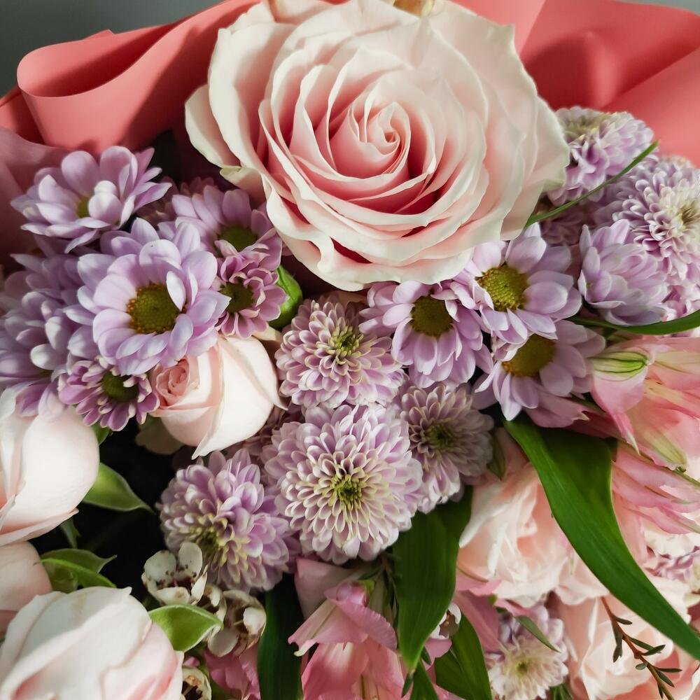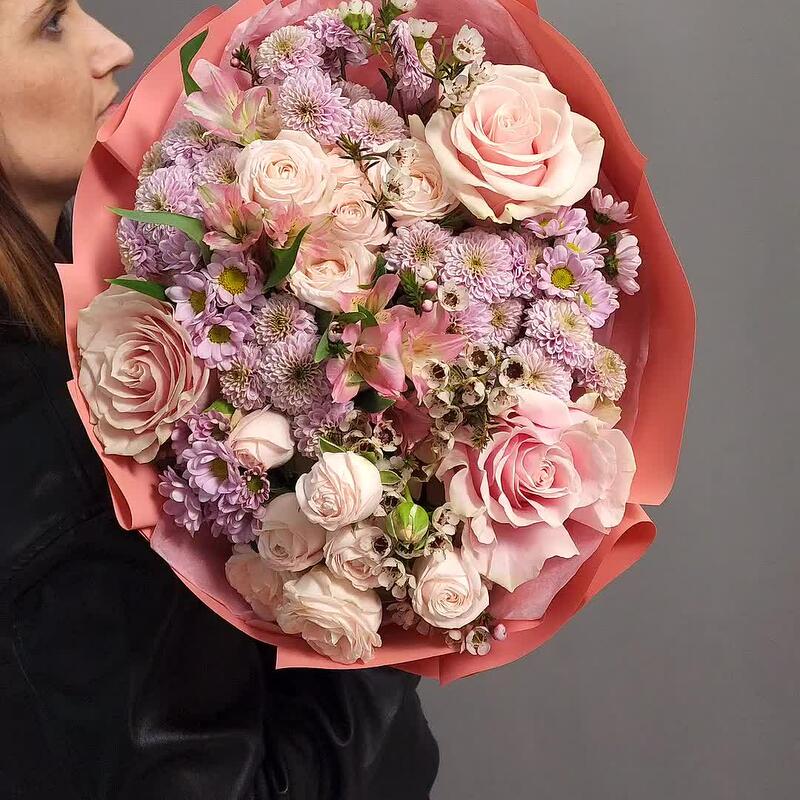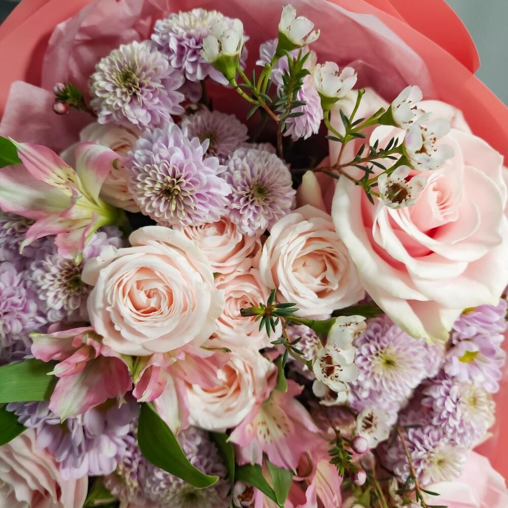 Альстромерии, Гвоздики, Кустовые розы, Лизиантусы, Розы, Хризантемы