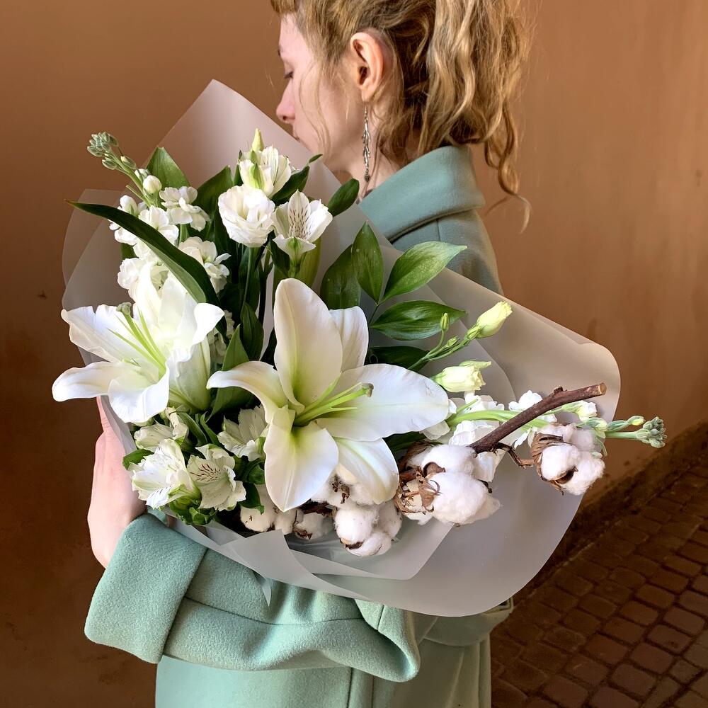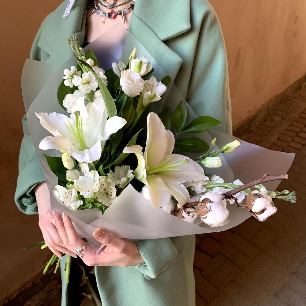 Альстромерия – 2 шт.Маттиола – 2 шт.Лилия белая – 1 шт.Лизиантус белый – 1 шт.Рускус сочи – 3 шт.Хлопок ветка – 1 шт.Авторская упаковка – 1 шт.