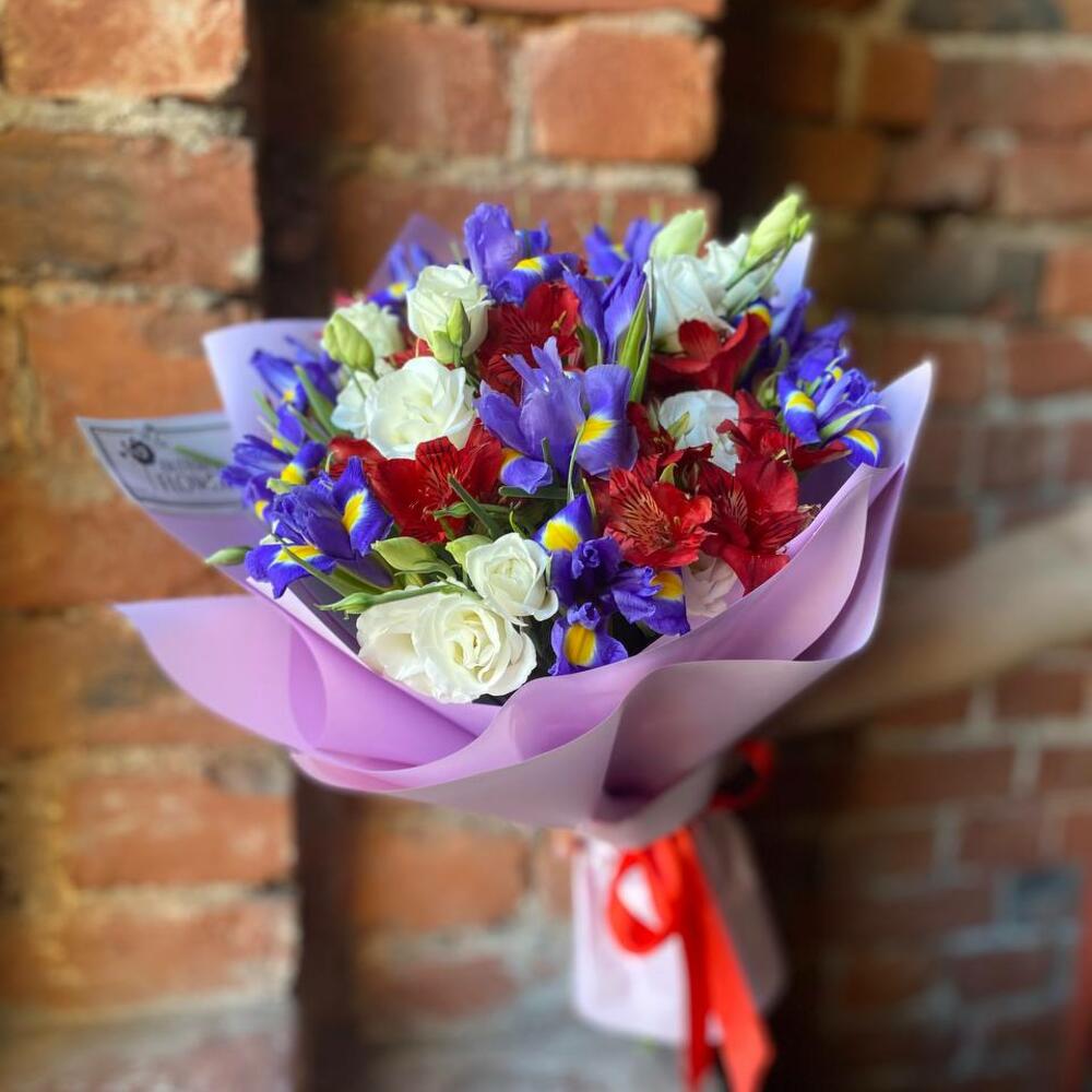 Ирис – 11 шт.Эустома – 4 шт.Альстромерия – 4 шт.Упаковка – 2 шт.