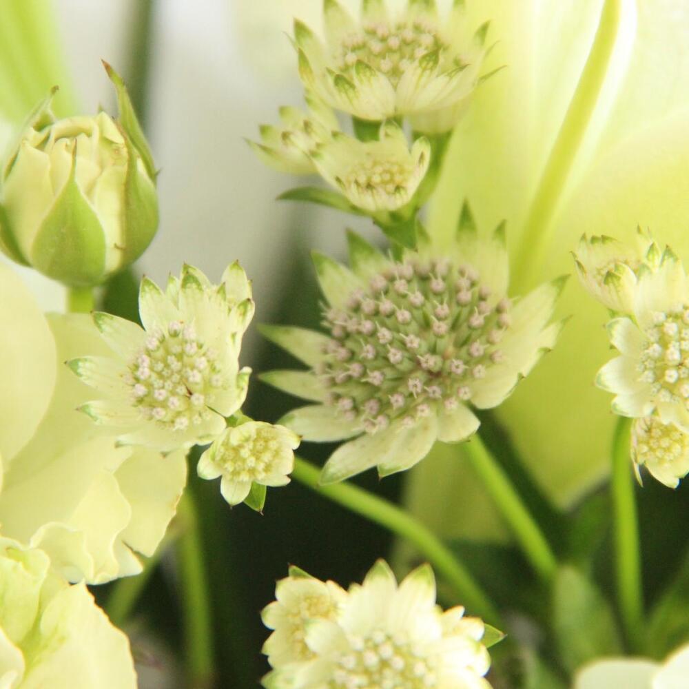 Лилия лонги – 2 шт.Амми – 3 шт.Лизиантус – 3 шт.Львиный зев – 3 шт.Ветки малины – 4 шт.Фисташка – 2 шт.Астранция – 2 шт.Упаковка – 1 шт.Лента атласная – 1 шт.Пион – 3 шт.