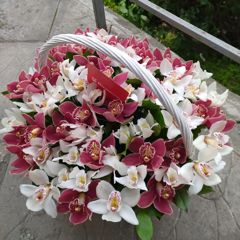 Орхидея Цимбидиум – 4 шт.Корзина плетеная – 1 шт.Оазис флористический – 3 шт.зелень декоративная – 10 шт.