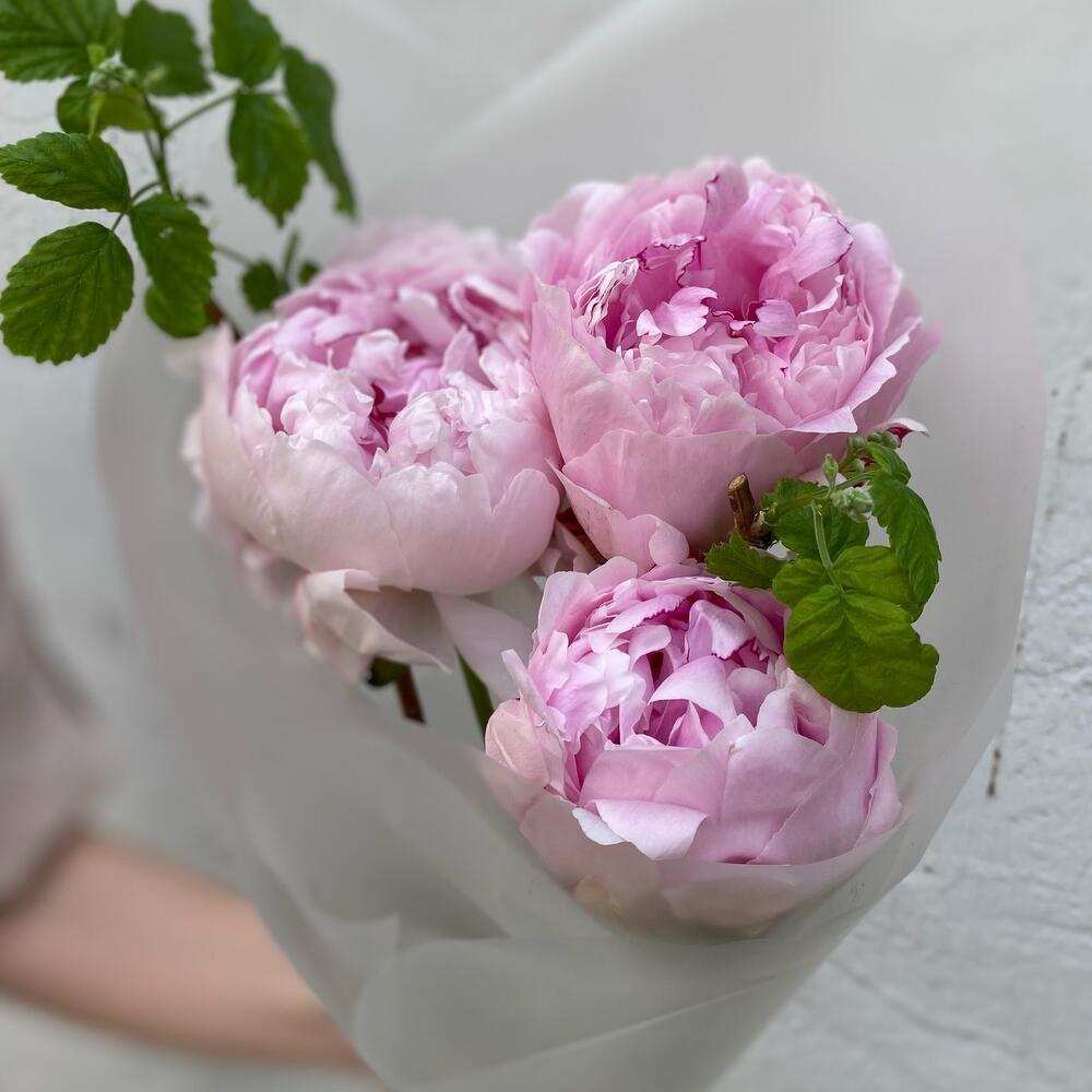 Пион Сара Бернар – 3 шт.ветка малины – 1 шт.Дизайнерская упаковка – 1 шт.