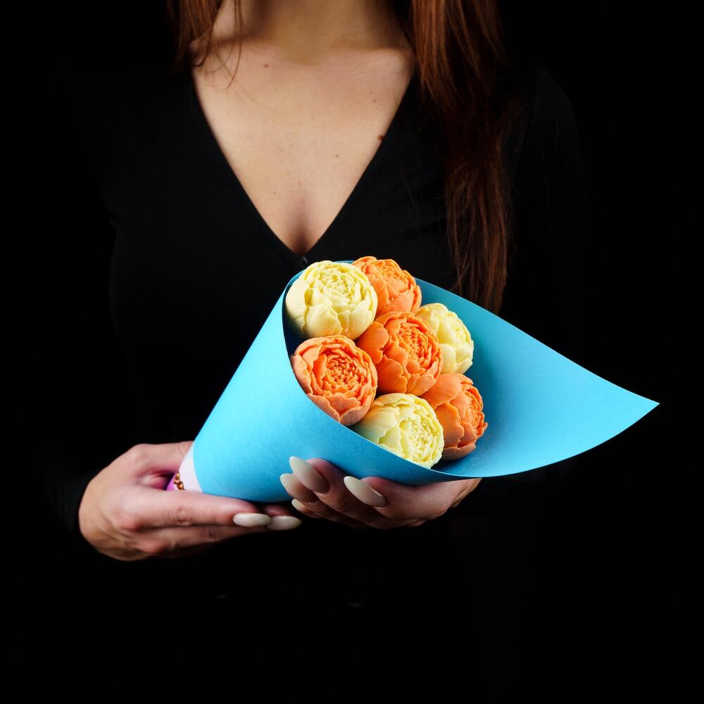 шоколадные пионы из бельгийского шоколада – 7 шт.Упаковка Кулек – 1 шт.Прозрачная пленка – 1 шт.