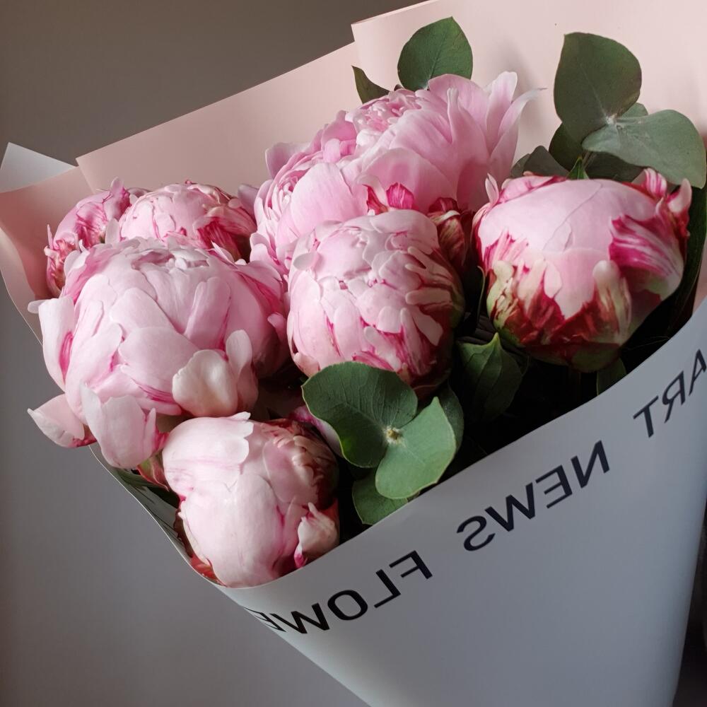 Пион – 7 шт.Эвкалипт – 2 шт.Упаковка – 3 шт.Лента атласная – 1 шт.