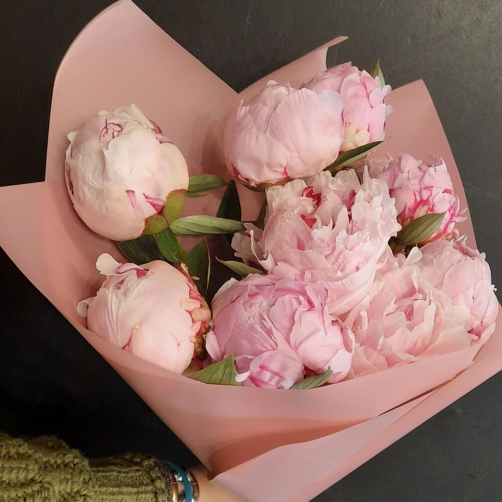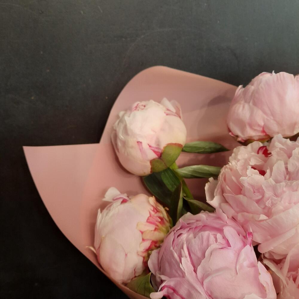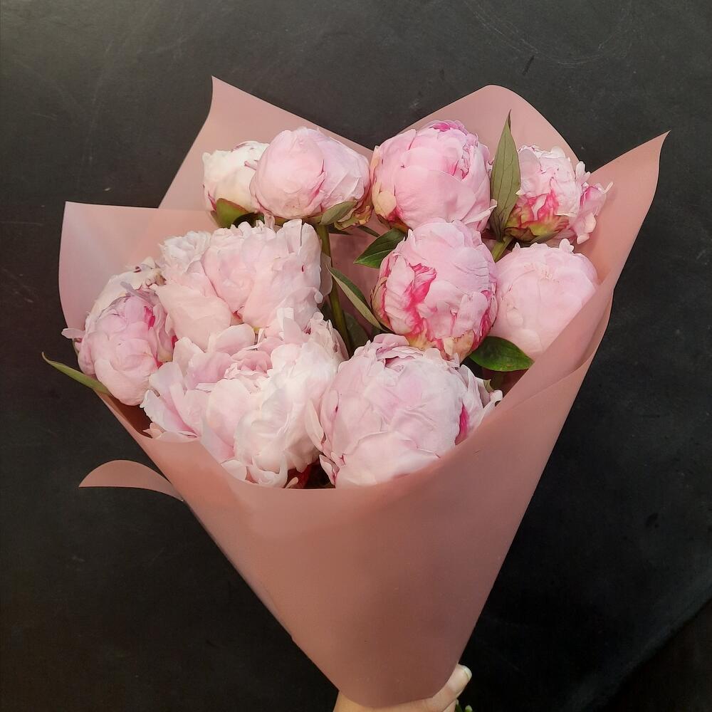 Букет розовых пионов в дизайнерской упаковке 9 шт