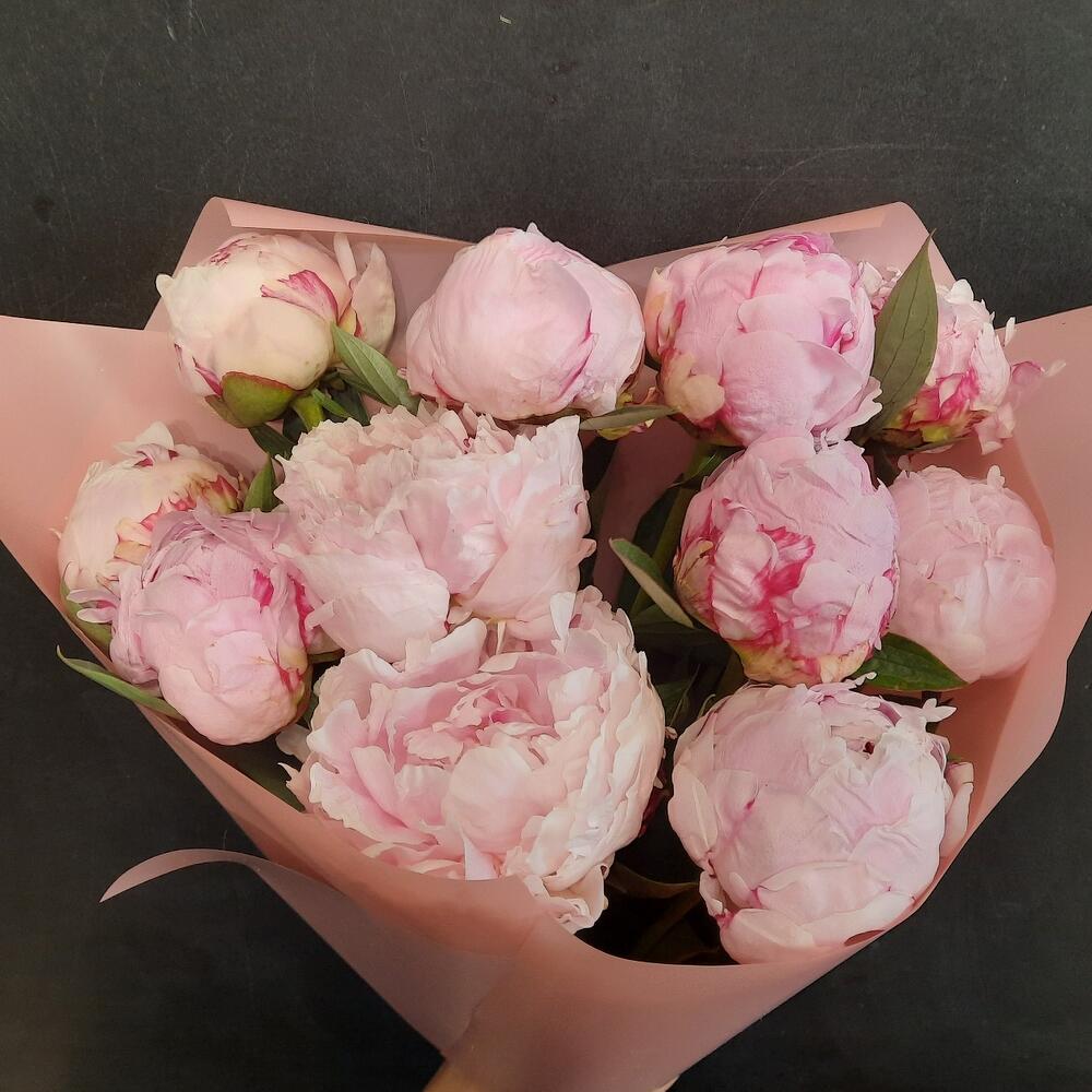 Лента атласная – 2 шт.Пион Сара Бернард – 11 шт.Калька упаковка – 1 шт.