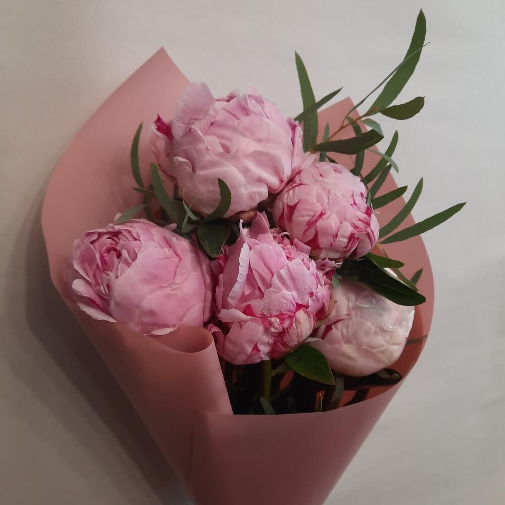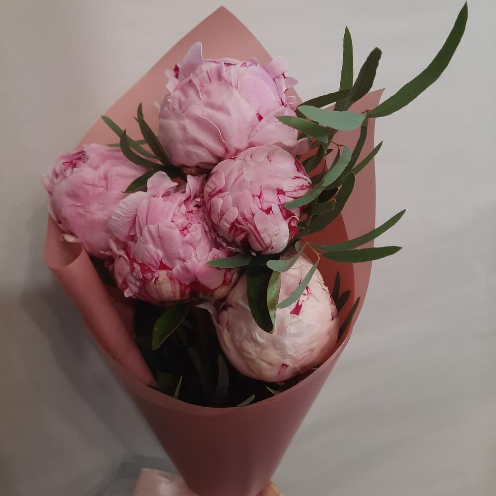 Эвкалипт – 1 шт.Лента атласная – 2 шт.Пион Сара Бернар – 5 шт.Калька упаковка – 1 шт.