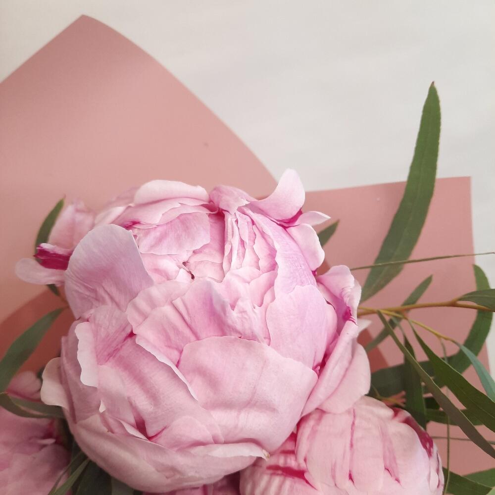Пионы Сара Бернар и веточка эвкалипта в нежной упаковке