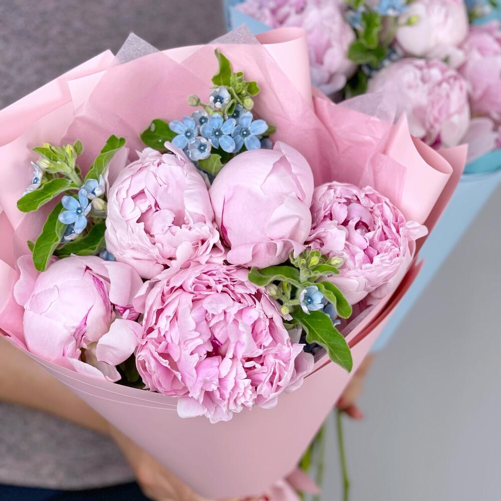 Пион – 5 шт.оксипеталум голубой – 3 шт.Упаковка дизайнерская – 1 шт.