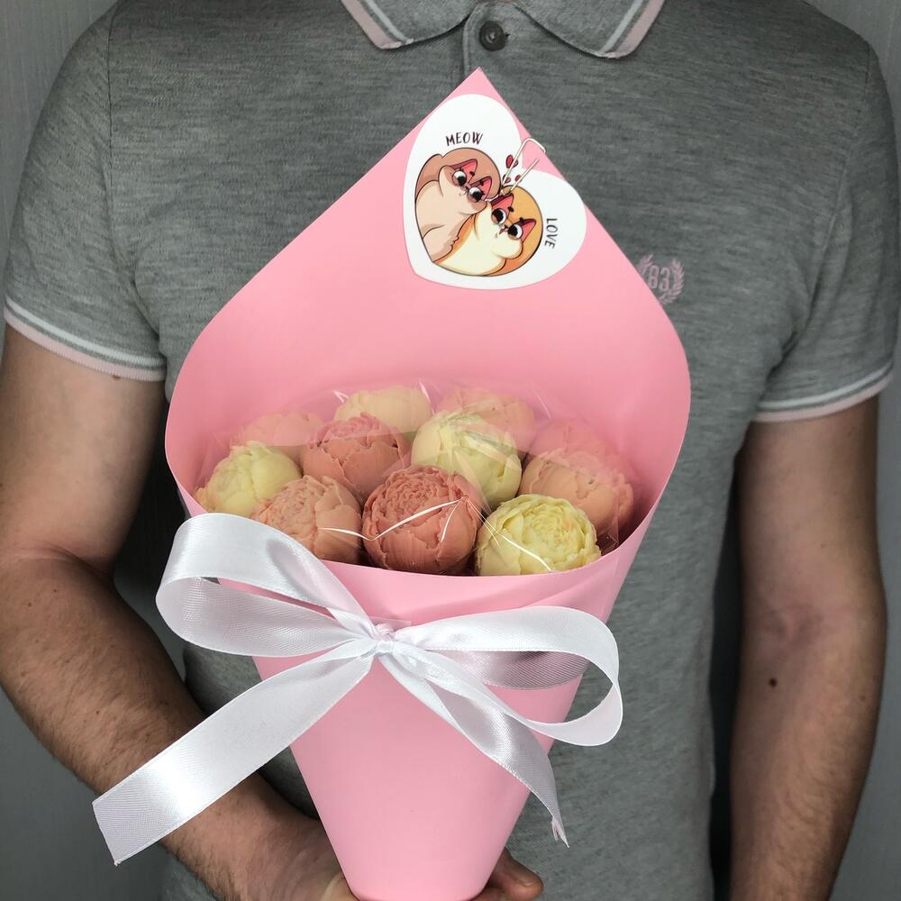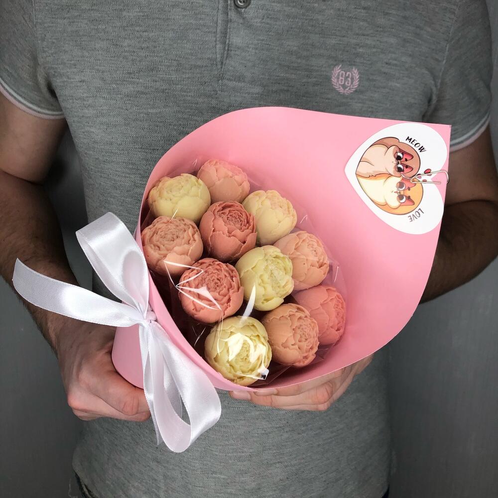 Мини открытка – 1 шт.шоколадные пионы из бельгийского шоколада – 11 шт.