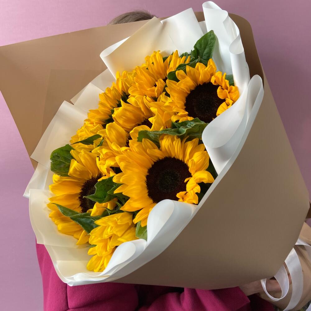 Подсолнух – 9 шт.Корейская упаковка – 2 шт.бант атласный – 1 шт.