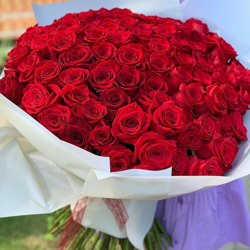 Букет, который впечатляет однозначно и бесповоротно. Букет из 101 розы. Чтобы каждый букет чувствовал себя хорошо долгое время, мы крепим пакетик кризала-средство, продлевающее жизнь цветочков