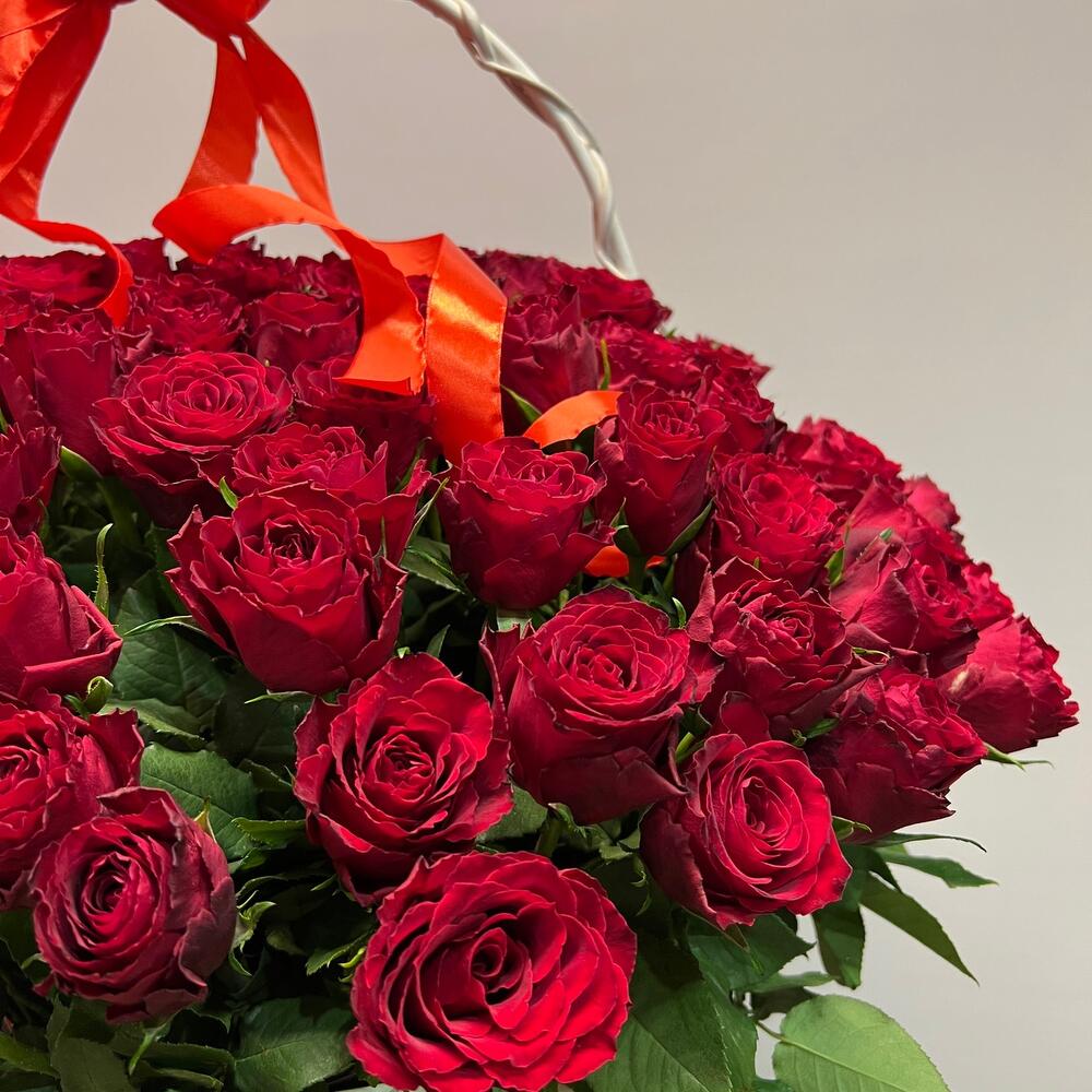 Метки: 101 роза, от 5000 руб, цветы в корзине