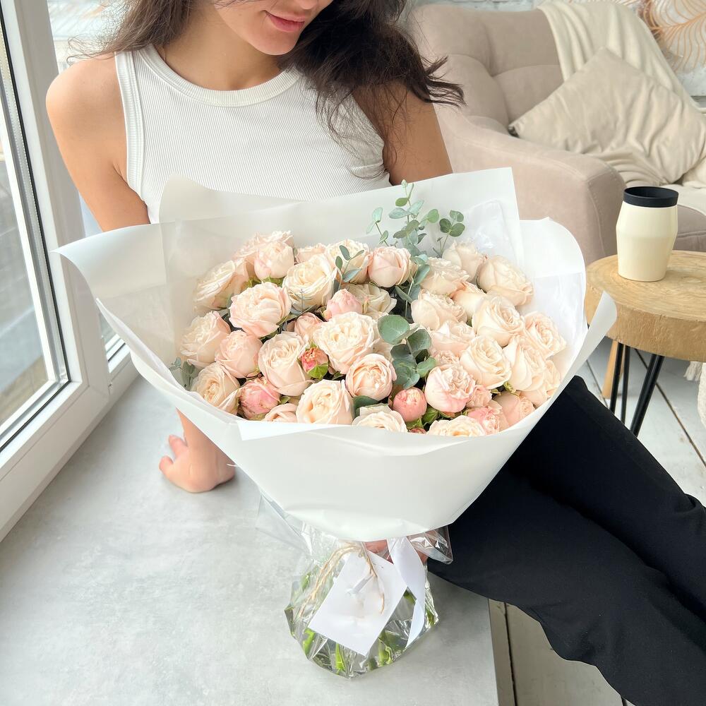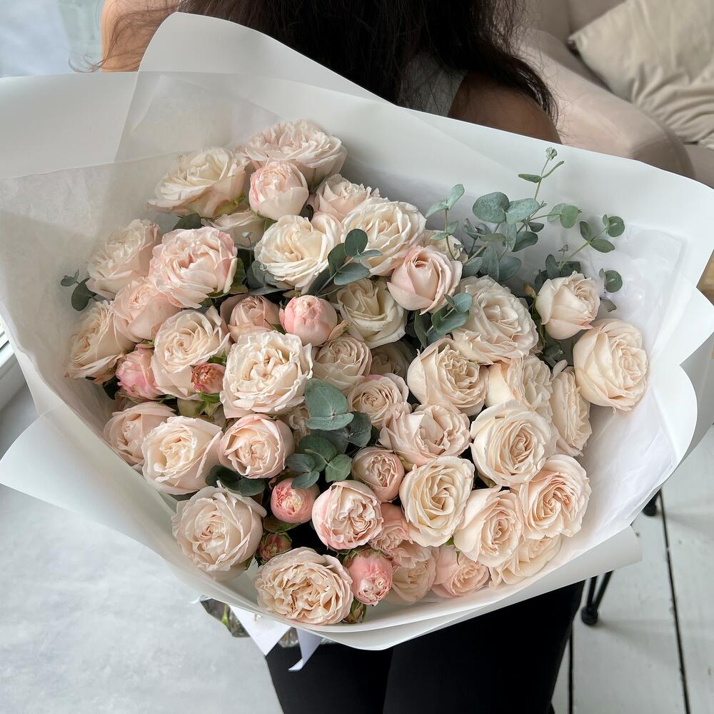 Кустовая пионовидная роза Бомбастик – 15 шт.Эвкалипт – 4 шт.