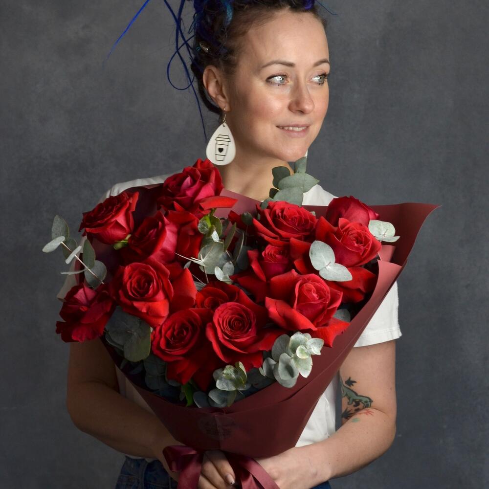 Роза фридом 60 см – 15 шт.Эвкалипт – 3 шт.