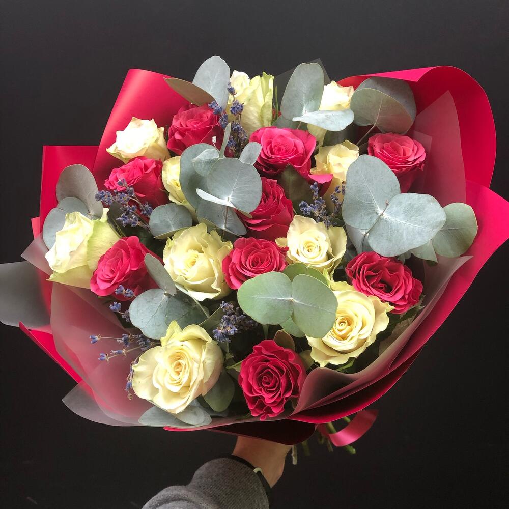 Лаванда (сухоцвет) – 5 шт.Эвкалипт – 3 шт.Роза Кенийская – 19 шт.Упаковка дизайнерская – 2 шт.